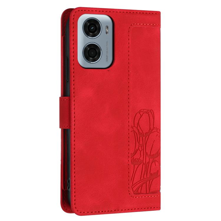 Funda de Cuero con Relieve de Tulipanes para Motorola Moto G05 con Cordón (Rojo)