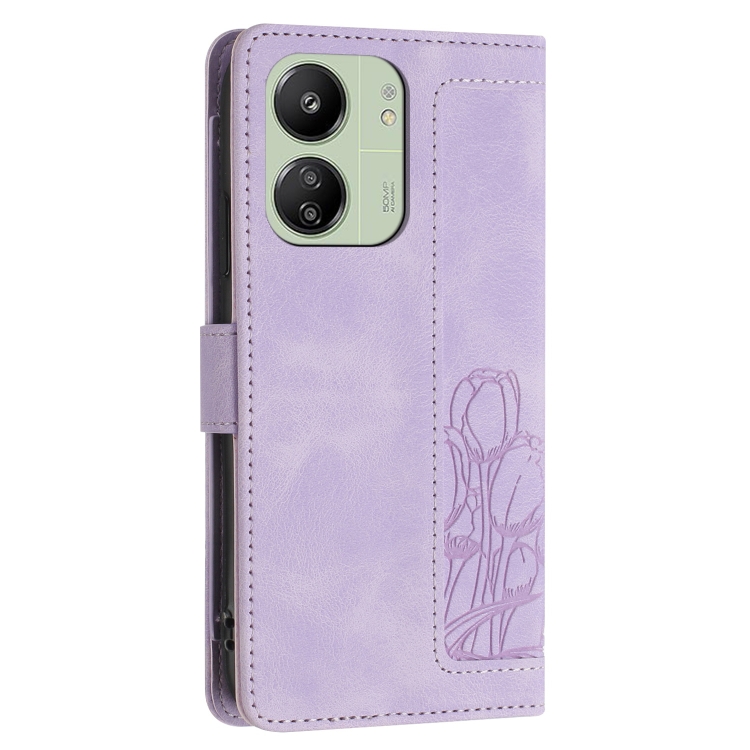 Funda de Cuero con Relieve de Tulipanes para Redmi 13C 4G/5G con Cordón (Morado)