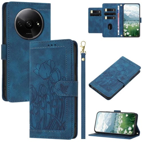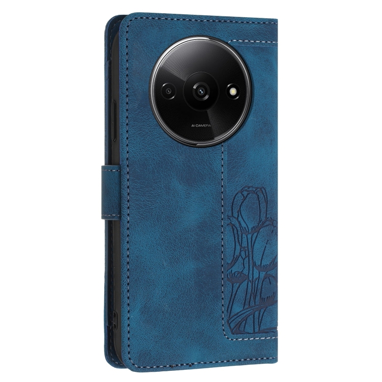 Funda de Cuero con Relieve de Tulipanes para Redmi A3 con Cordón (Azul)