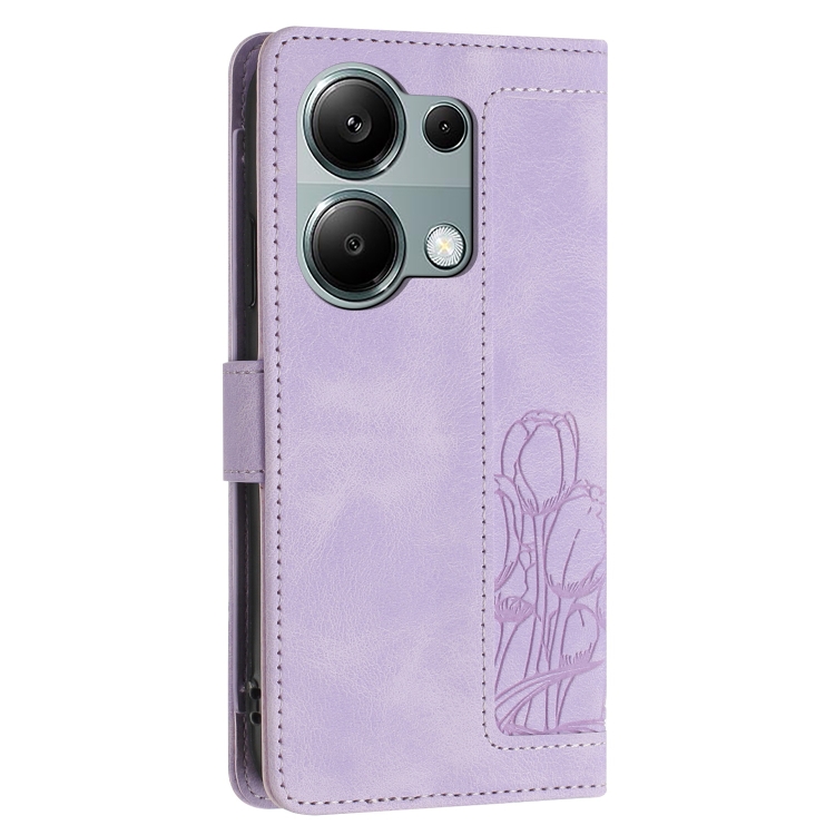 Funda de Cuero con Relieve de Tulipanes para Redmi Note 13 Pro 5G con Cordón (Morado)