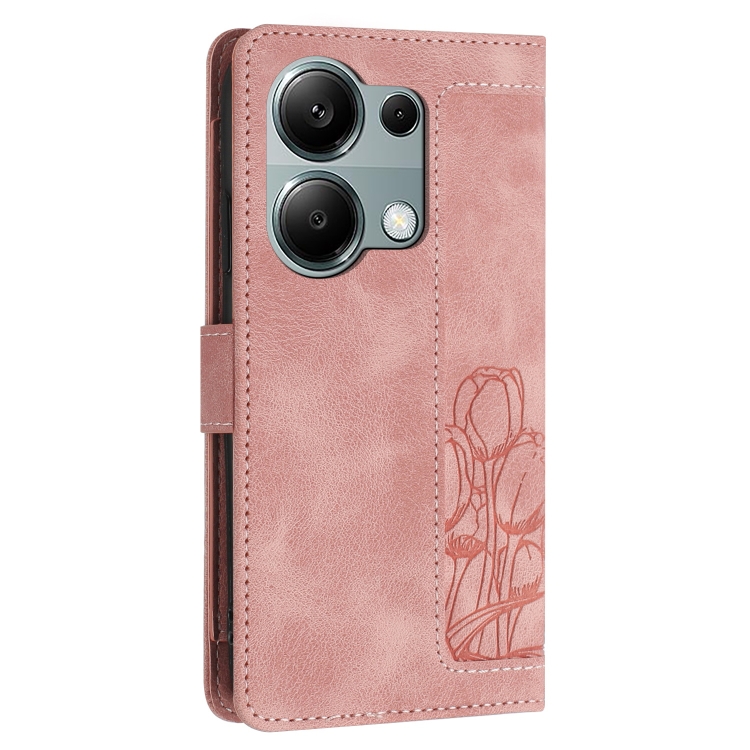 Funda de Cuero con Relieve de Tulipanes para Redmi Note 13 Pro 5G con Cordón (Rosa)