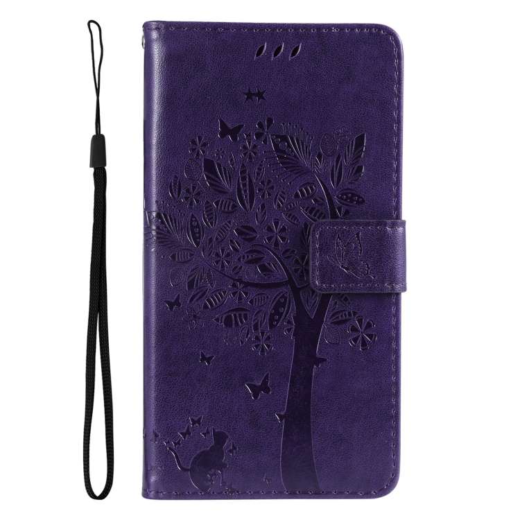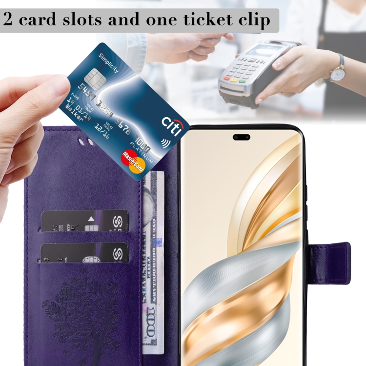 Funda de Cuero con Tapa para Honor X9C 5G Global con Estampado de Árbol y Gato (Morado)