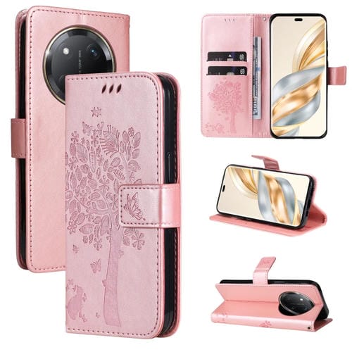 Funda de Cuero con Tapa para Honor X9C 5G Global con Estampado Árbol y Gato (Oro Rosa)