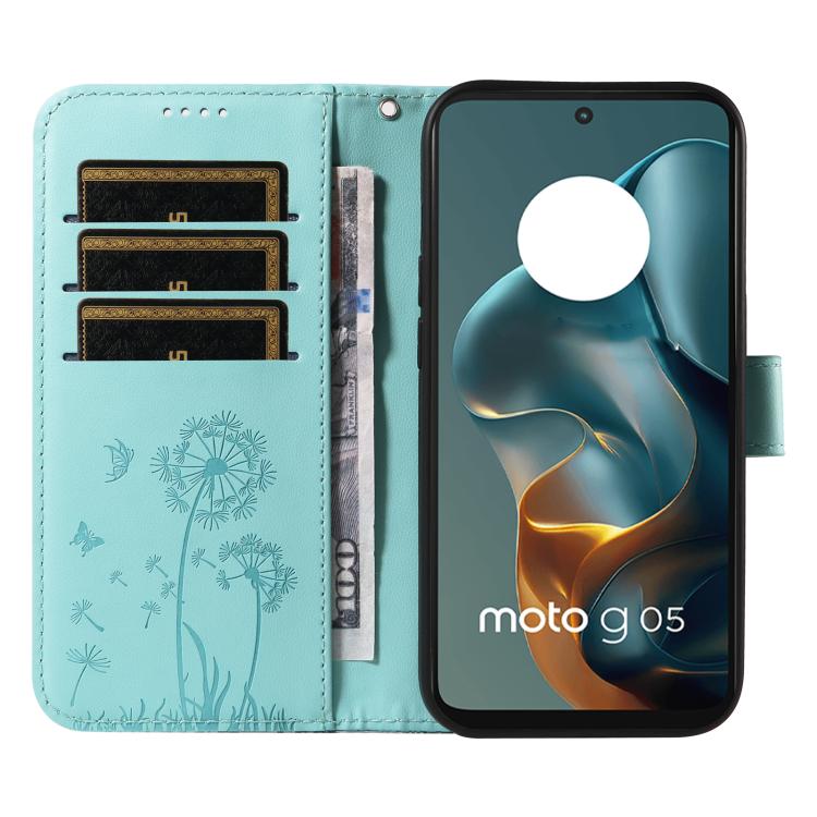 Funda de Cuero con Tapa para Motorola Moto G05 con Diseño Diente de León en Relieve (Verde)