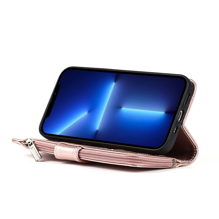 Funda de Cuero con Tapa Horizontal con Cremallera de Microfibra para iPhone 13 Pro con Soporte y Ranuras para Tarjetas (Oro Rosa)
