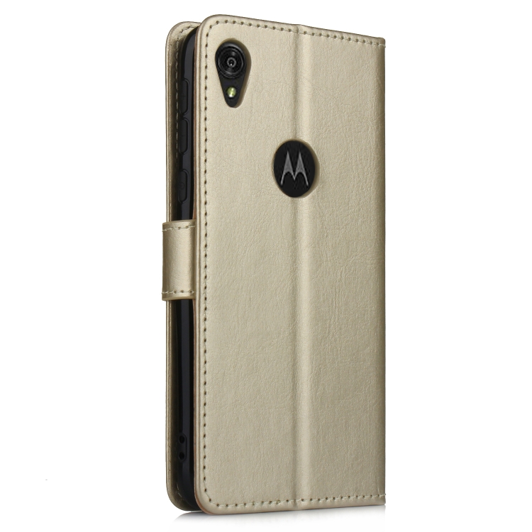 Funda de Cuero Motorola Moto E6 con Tapa Horizontal Retro, Soporte, Ranuras y Marco de Fotos (Dorado)