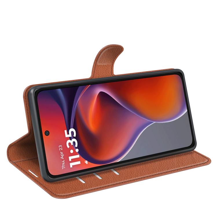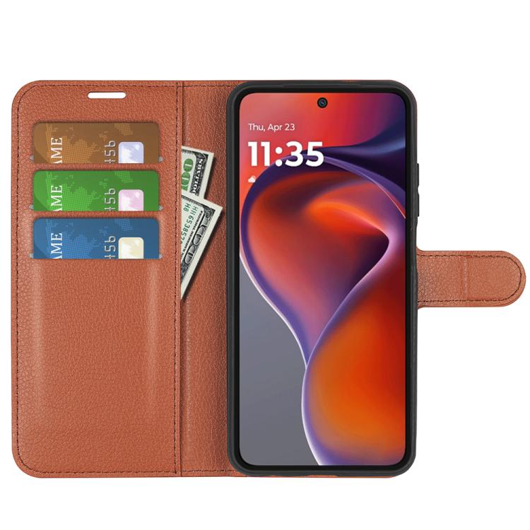 Funda de Cuero con Tapa Horizontal y Textura de Lichi para Motorola Moto G15 con Soporte (Marrón)