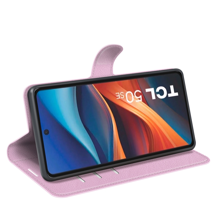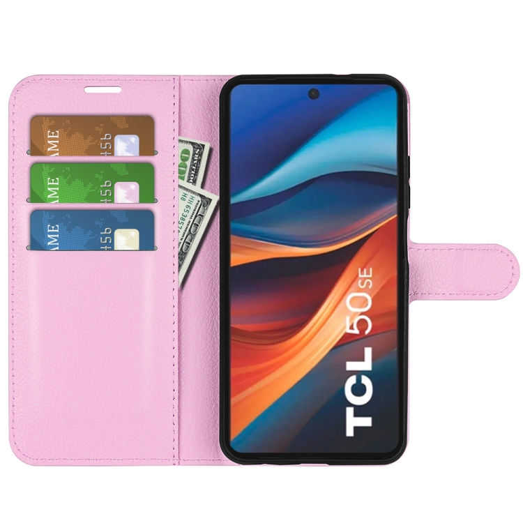 Funda de Cuero con Tapa Horizontal Textura de Lichi para TCL 50 Se con Soporte (Rosa)
