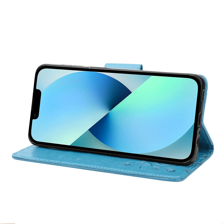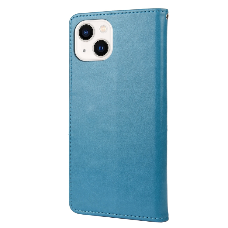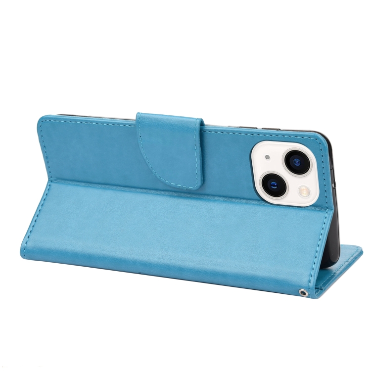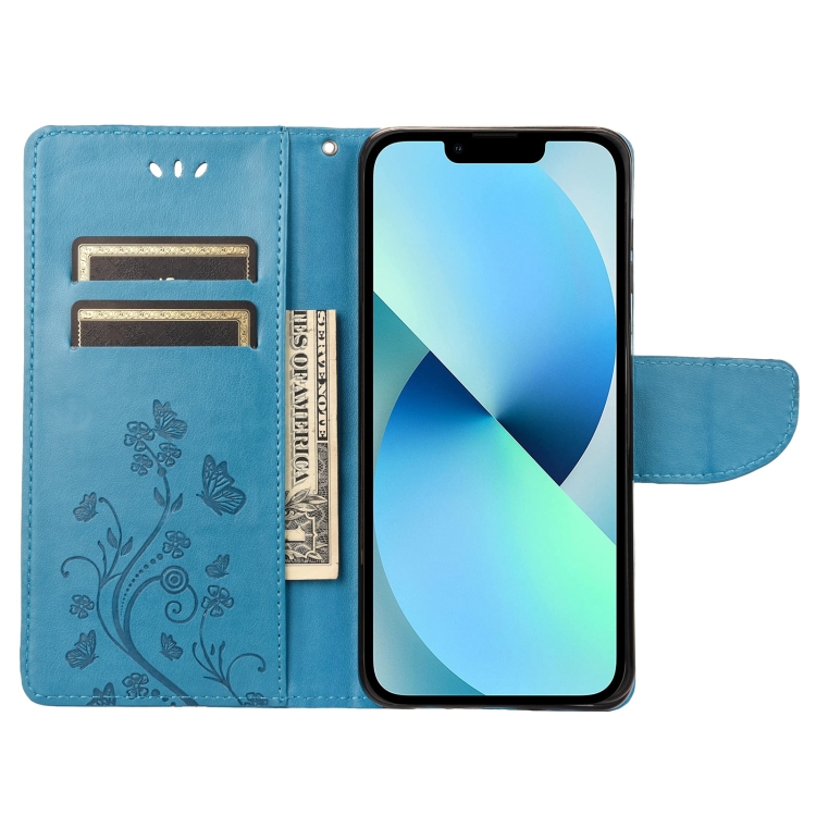 Funda de Cuero con Tapa para iPhone 14 Estampado Flores Mariposa (Azul)