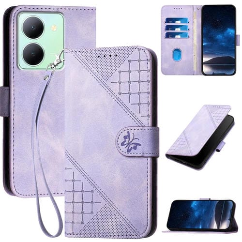Funda de Cuero con Tapa y Cordón para Vivo Y36 5G Global Yx0080 con Diseño En Relieve de Mariposa y Cuadrícula (Morado Claro)
