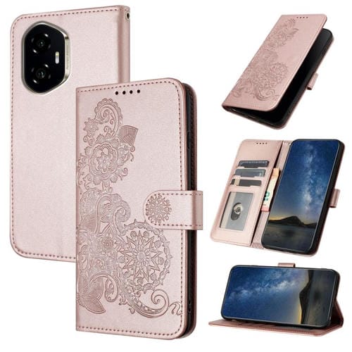 Funda de Cuero con Tapa para Honor 300 con Diseño de Flor de Datura en Relieve (Oro Rosa)
