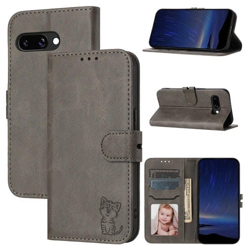 Funda de Cuero con Tapa para Google Pixel 9A Diseño Gato Feliz En Relieve (Gris)