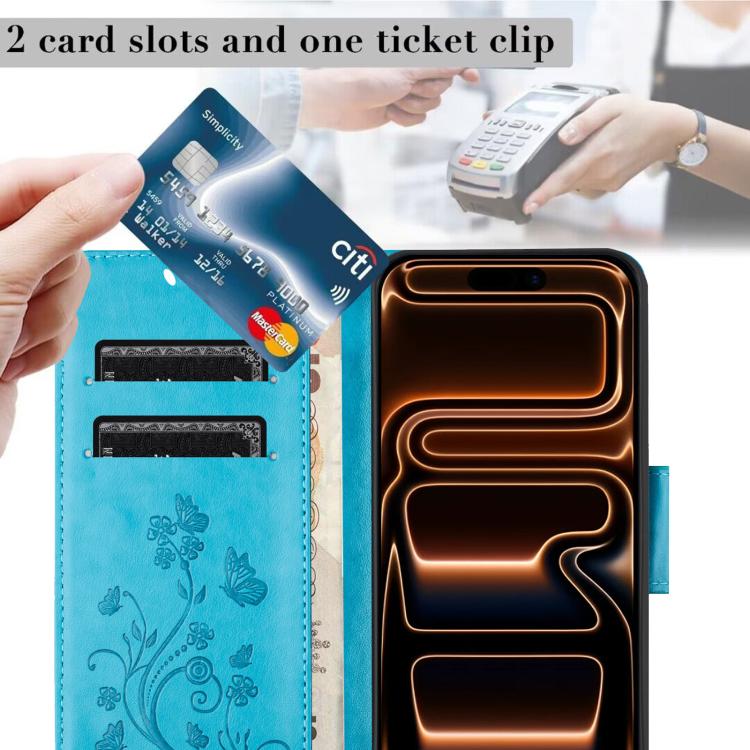 Funda de cuero con tapa y diseño de mariposas y flores para iPhone 17 Pro (azul)