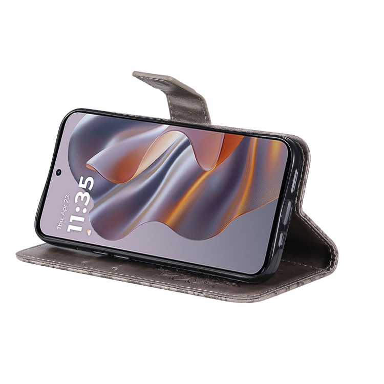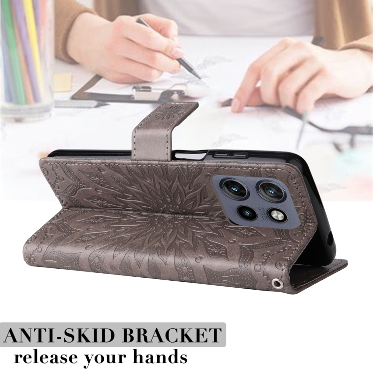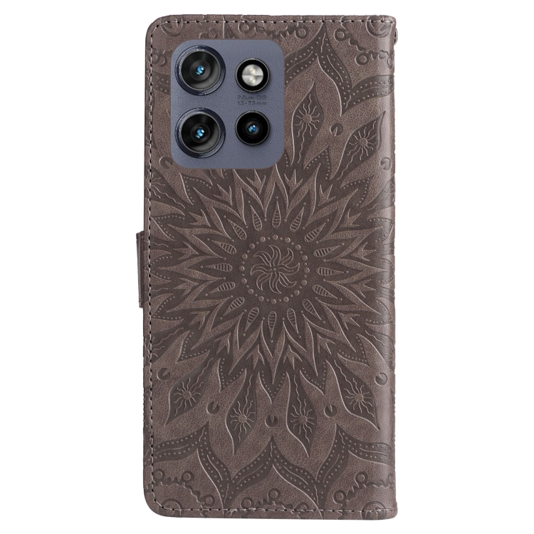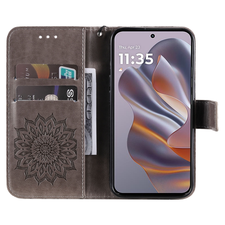 Funda de Cuero con Tapa y Estampado de Girasoles en Relieve para Motorola Edge 50 Neo (Gris)