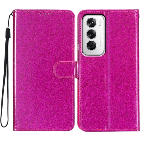 Funda de Cuero con Tapa y Purpurina para Oppo Reno12 Global (Rosa y Rojo)