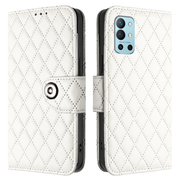 Funda de Cuero con Tapa y Textura Rombal para OnePlus 9R/8T con Cordón (Blanco)