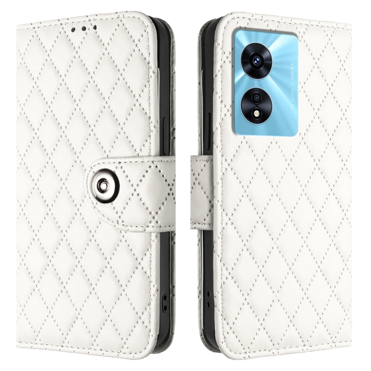 Funda de Cuero con Tapa y Textura Rombal para OnePlus Nord N300 con Cordón (Blanco)