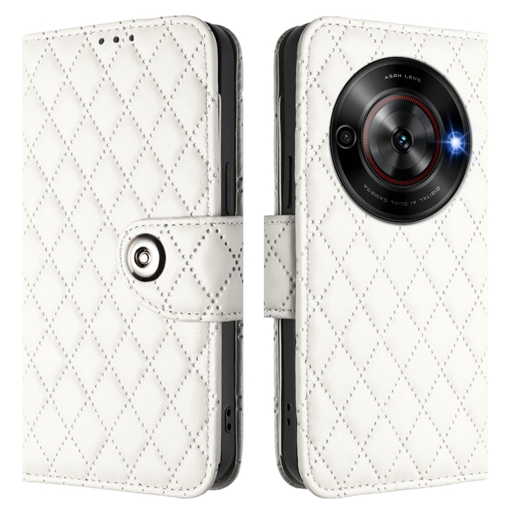 Funda de Cuero con Tapa y Textura Rombal para ZTE Blade A75 5G con Cordón (Blanco)
