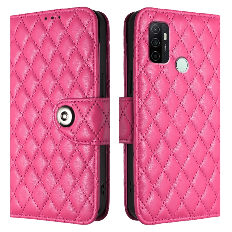 Funda de Cuero con Tapa y Textura Rómbica para Oppo A53S 4G/A33 2020 4G con Cordón (Rosa y Rojo)