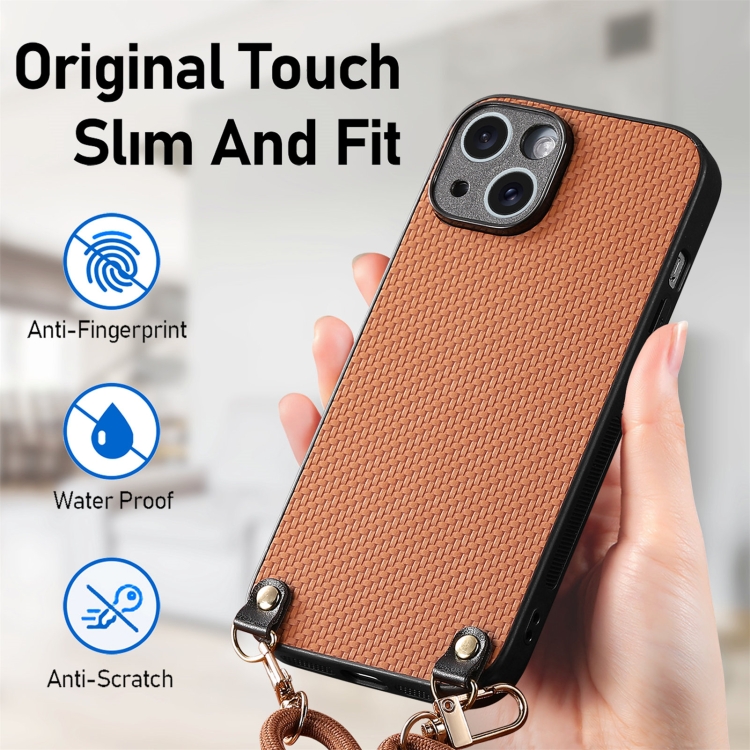 Funda de Cuero para iPhone 16 Pro Max con Textura de Fibra de Carbono y Correa Cruzada (Marrón)