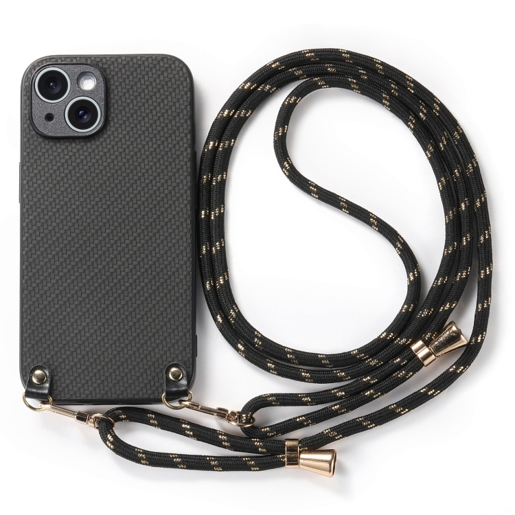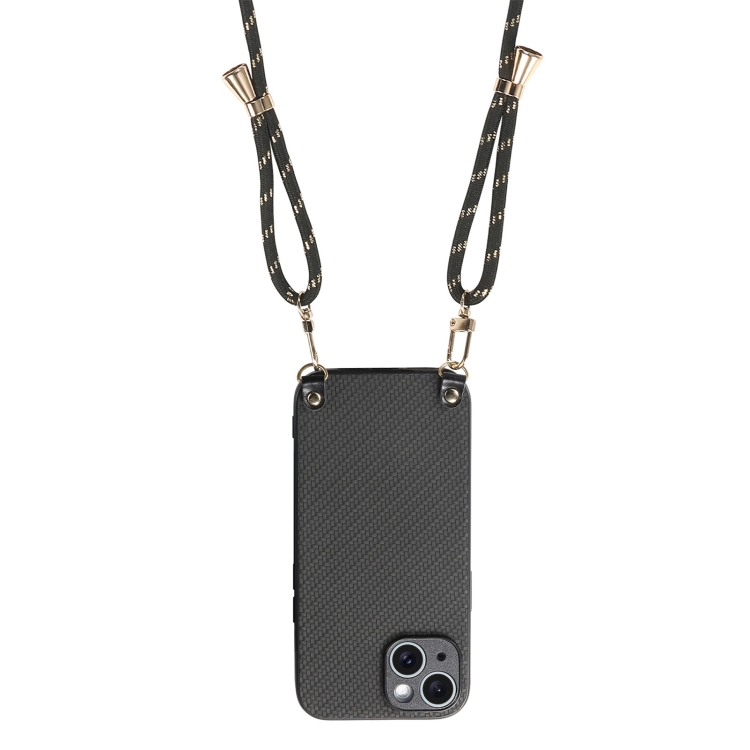 Funda de Cuero con Textura de Fibra de Carbono para iPhone 16 Pro Max con Correa Cruzada (Negro)
