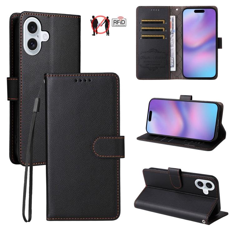 Funda de cuero con textura de lichi para iPhone 17, con bloqueo RFID y capacidad para 3 tarjetas (negra)