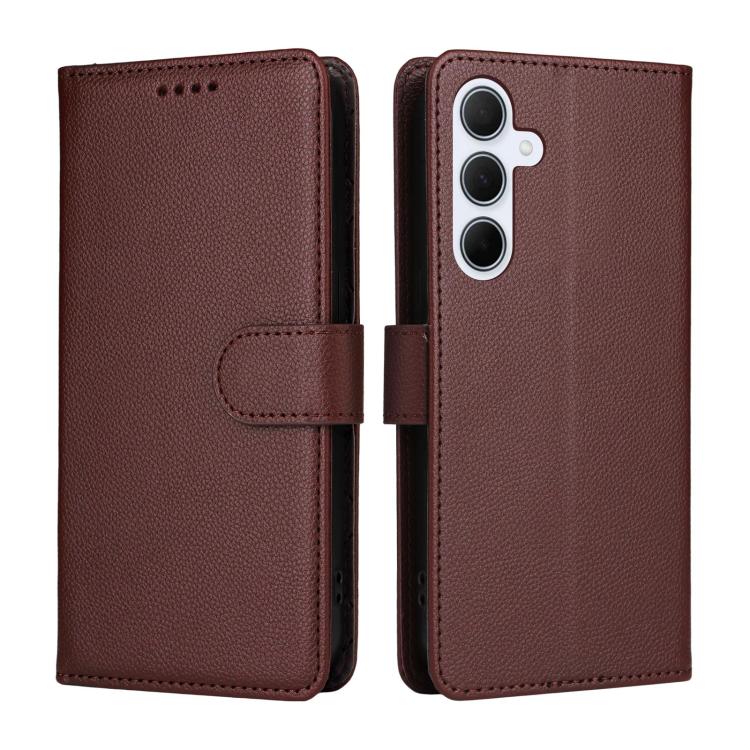 Funda de cuero con textura Litchi para Samsung Galaxy A55 5G, con bloqueo RFID y capacidad para 3 tarjetas (marrón)