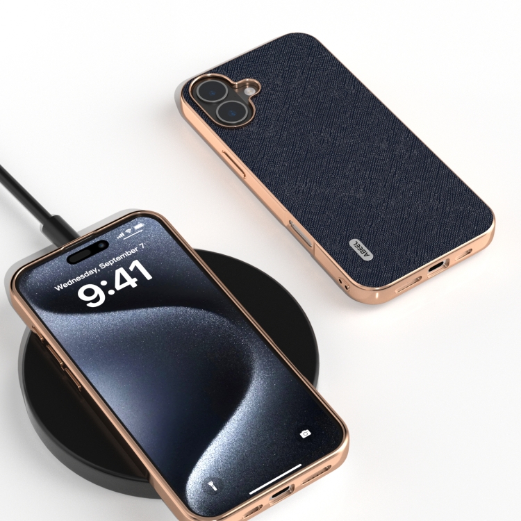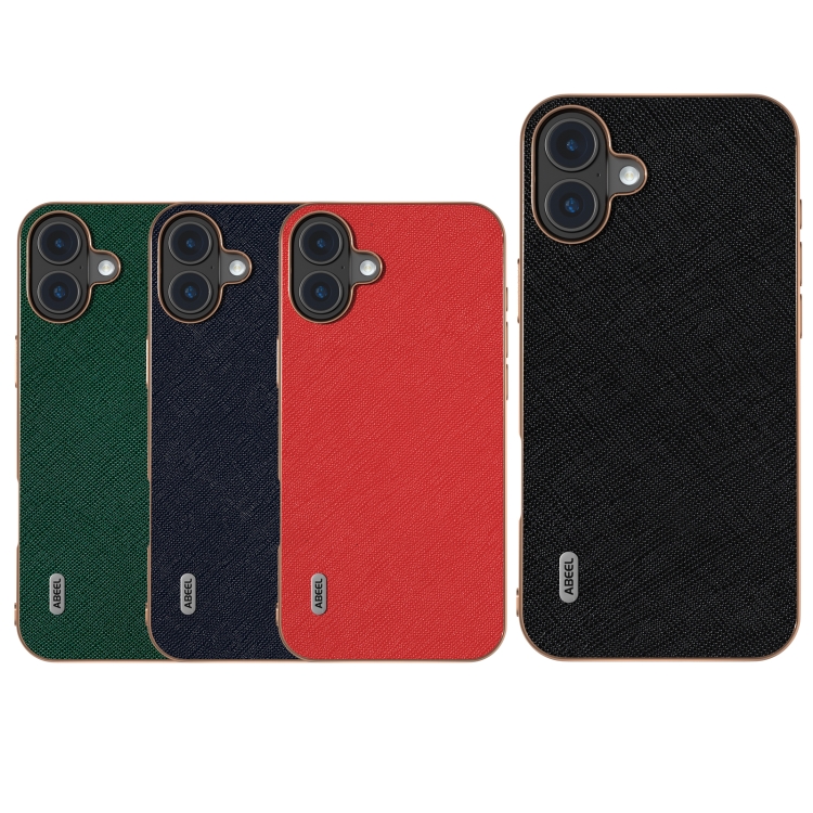 Funda de Cuero Genuino Abeel con Textura Cruzada y Marco Galvanizado para iPhone 16 Plus (Azul)