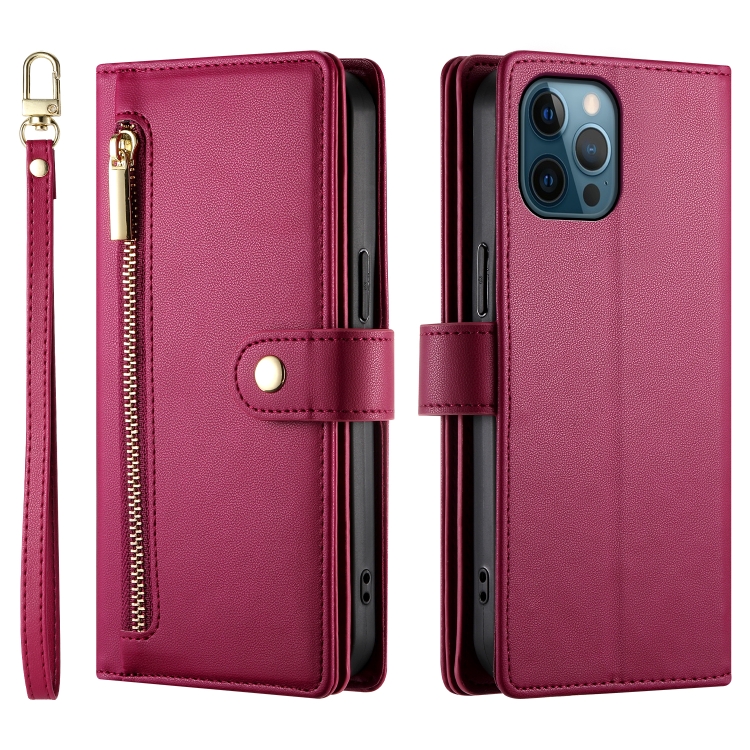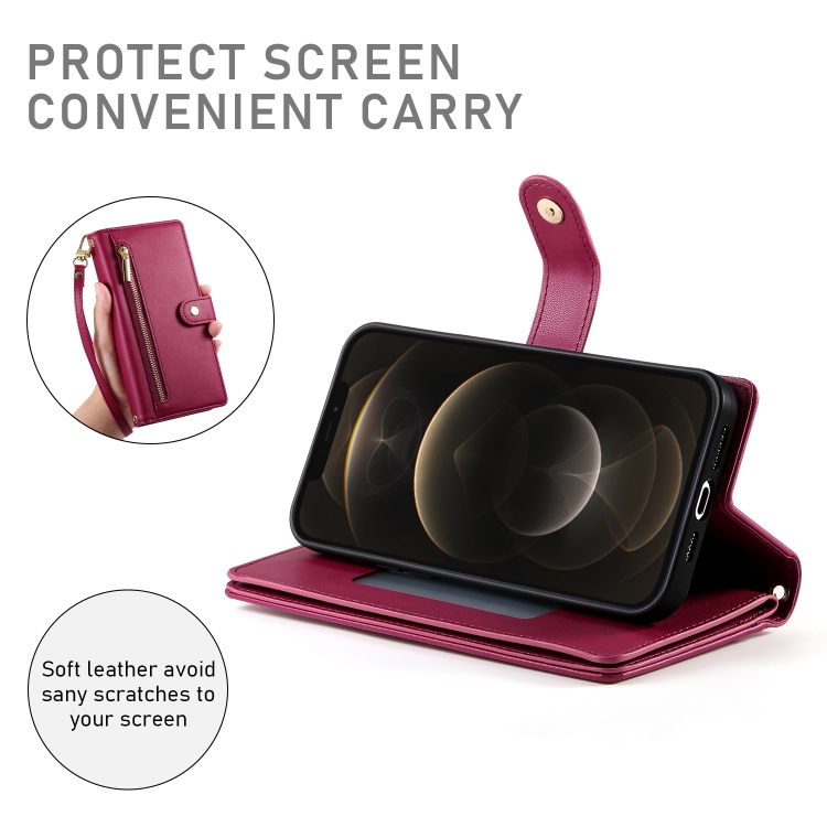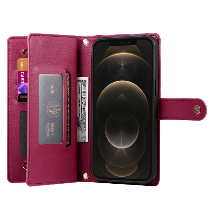 Funda de Cuero para Teléfono iPhone 12 Pro Max con 9 Ranuras y Cremallera (Rojo)