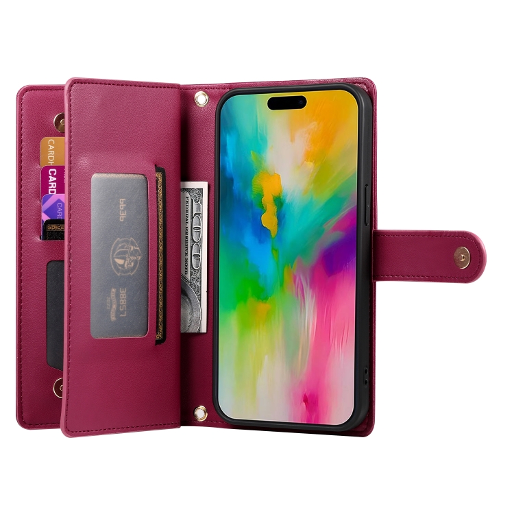 Funda de Cuero para Teléfono iPhone 16 Pro Max con 9 Ranuras para Tarjetas y Cremallera (Rojo)