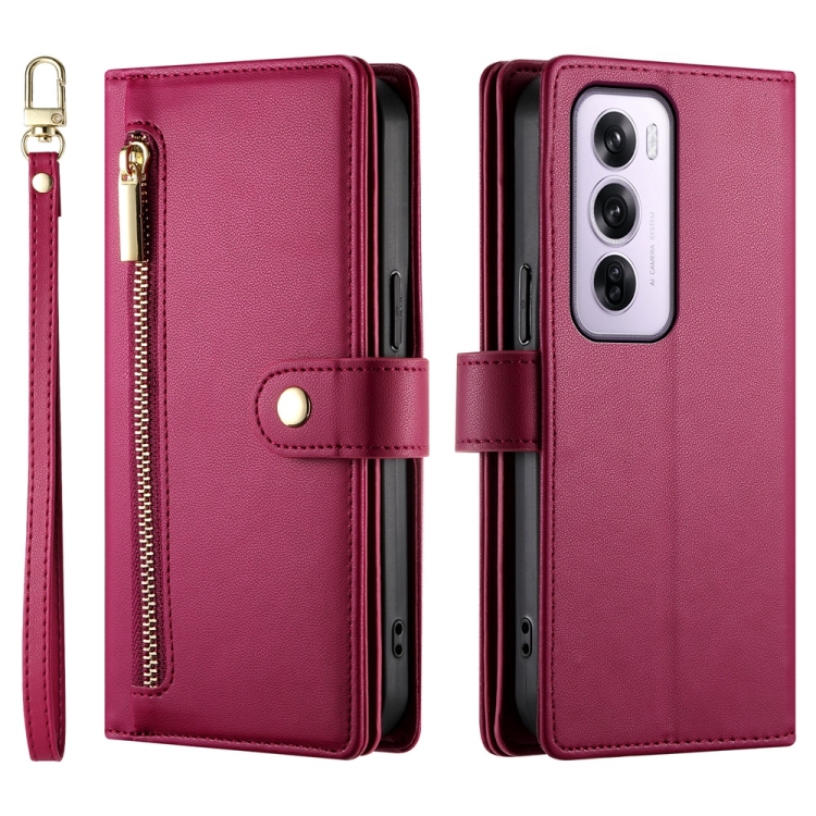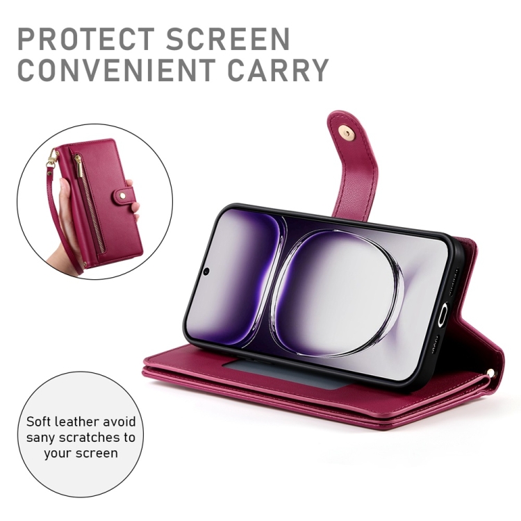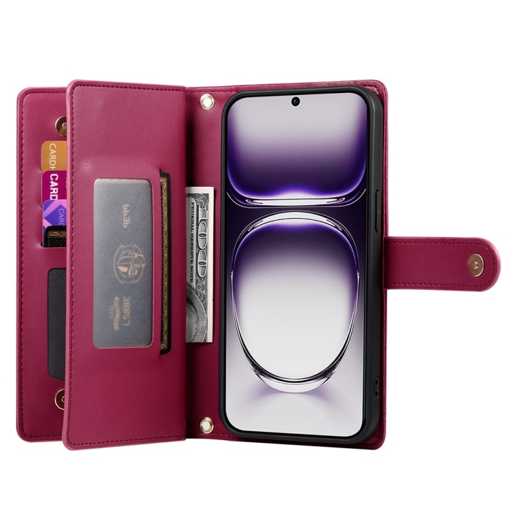Funda de Cuero para Teléfono con Nueve Ranuras para Tarjetas y Cremallera para Oppo Reno12 Pro Global (Rojo)