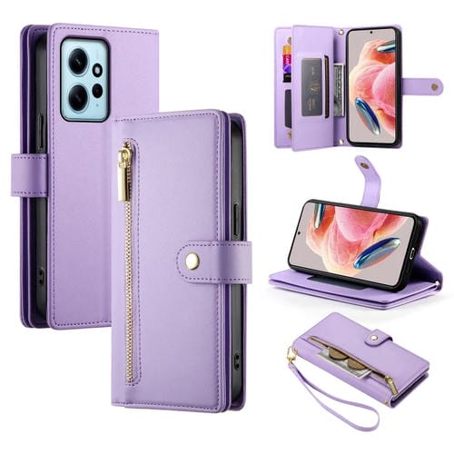 Funda de Cuero para Teléfono con Nueve Ranuras para Tarjetas y Cremallera para Redmi Note 12 4G/Note 12R Pro (Morado)