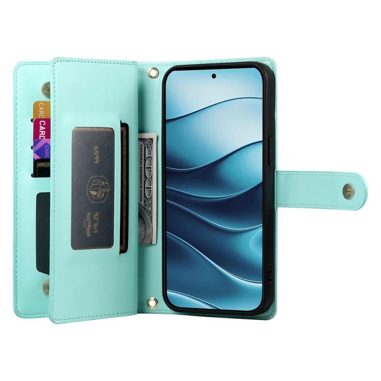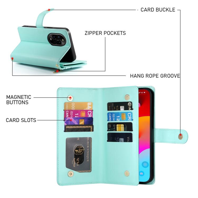 Funda de Cuero Huawei Nova 13 Pro con 9 Ranuras para Tarjetas y Cremallera (Verde Menta)
