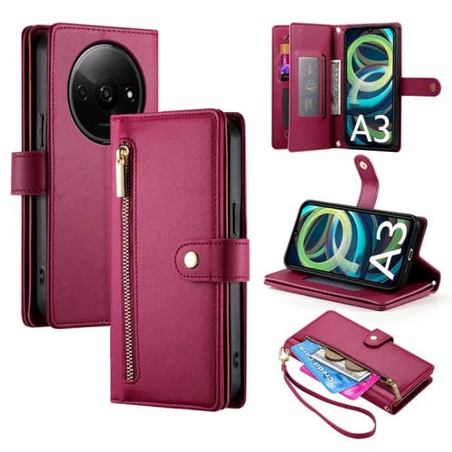 Funda de Cuero para Teléfono Redmi A3 con Nueve Ranuras para Tarjetas y Cremallera (Rojo)