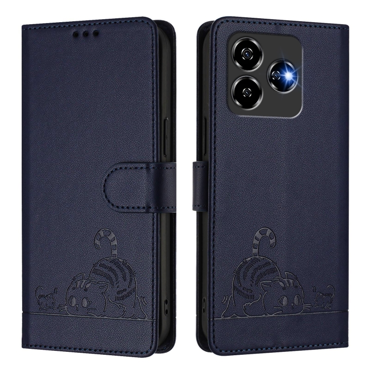 Funda de Cuero RFID para ZTE Blade V60 con Diseño Gato y Rata en Relieve y Cordón (Azul)