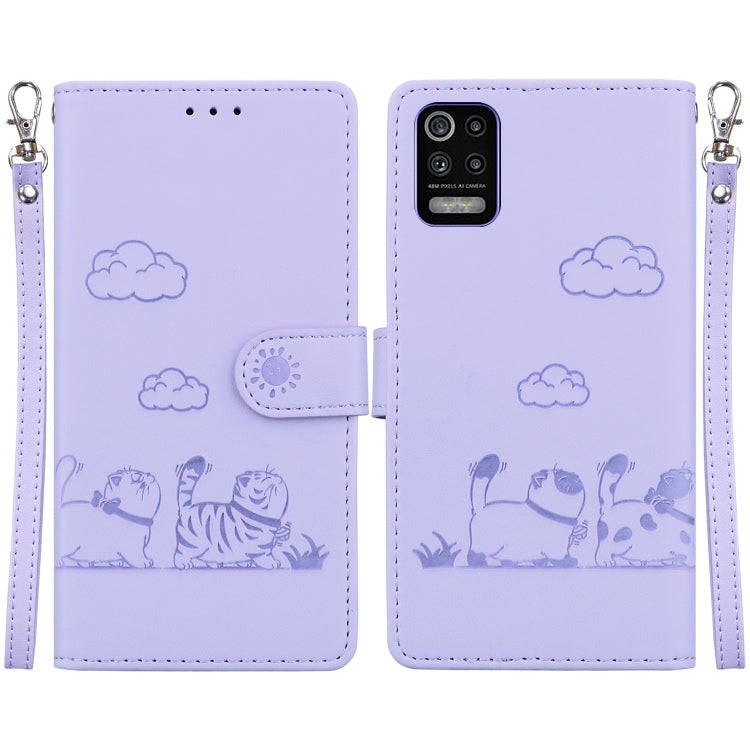 Funda de Cuero Rfid para LG K52/K62/Q52 con Diseño de Gatos (Morado)