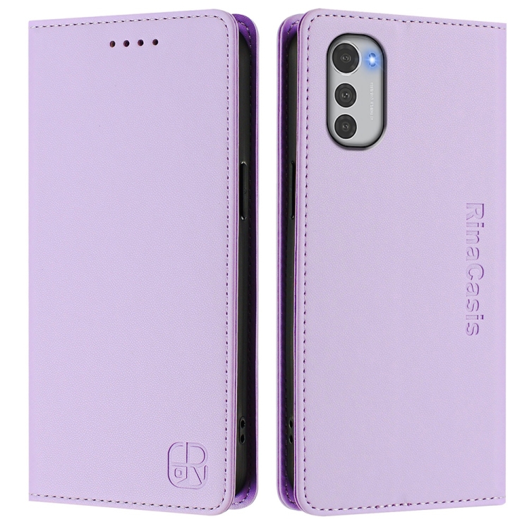 Funda de Cuero RFID con Doble Pliegue y Succión Magnética para Motorola Moto E32 Global Rc01 (Morado Claro)