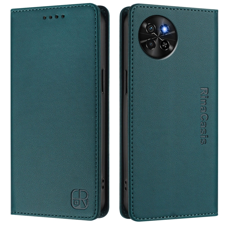 Funda de Cuero Rfid para Teléfono Itel S23/S665L Rc01 con Doble Pliegue y Succión Magnética (Verde Oscuro)