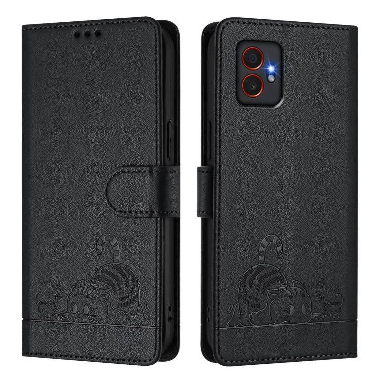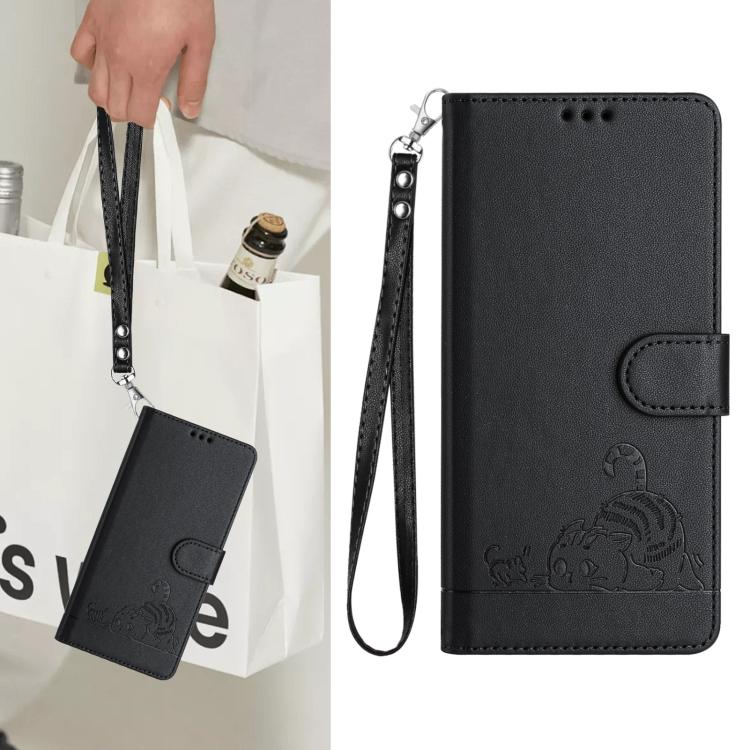 Funda de cuero RFID con estampado de gato y rata en relieve para Samsung Galaxy XCover7 Pro con cordón (negra)