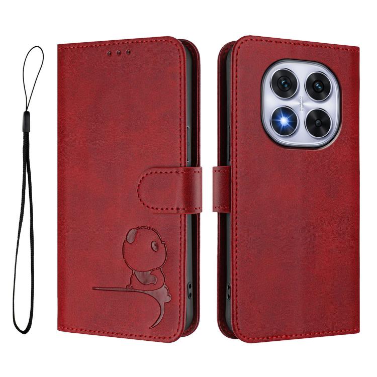 Funda de cuero RFID con estampado de panda y cordón para Redmi Note 14 Pro 5G / 14 Pro+ 5G (rojo vino)