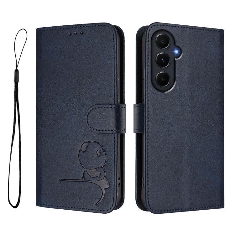 Funda de cuero RFID con estampado de panda y cordón para Samsung Galaxy A55 5G (azul)
