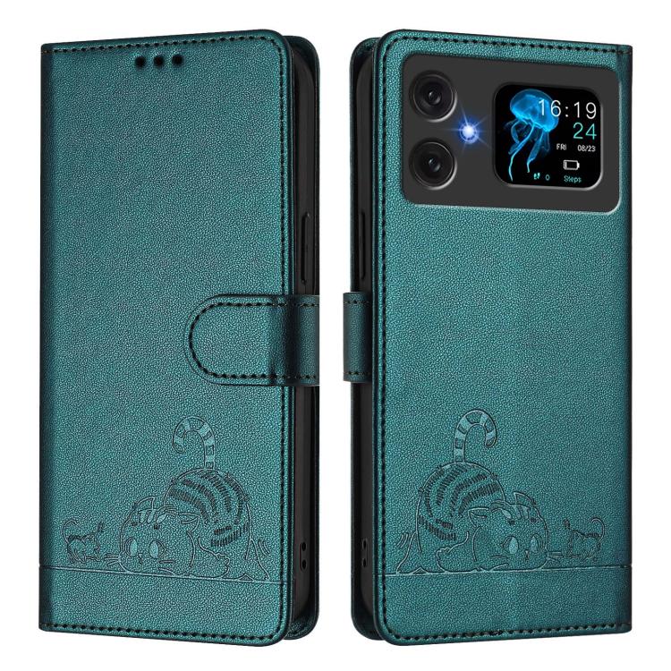 Funda de Cuero Rfid para Cubot A20 con Estampado de Rata y Gato en Relieve y Cordón (Verde Pavo Real)