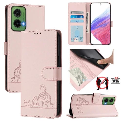 Funda de Cuero Rfid Motorola Moto G35 con Estampado de Rata y Gato en Relieve y Cordón (Rosa)