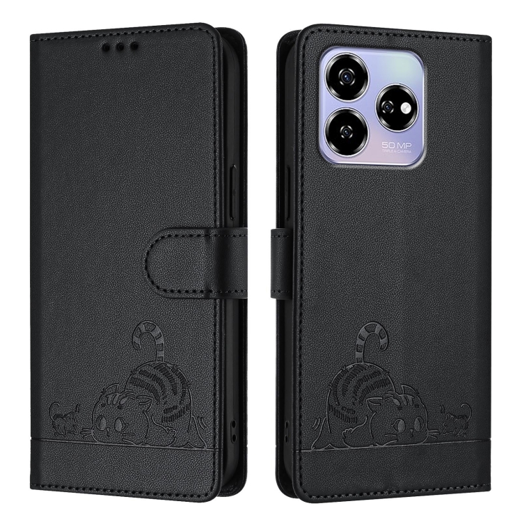 Funda de Cuero Rfid para ZTE Blade V60/Axon 60 4G con Estampado de Rata y Gato en Relieve y Cordón (Negro)