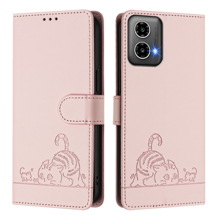 Funda de Cuero RFID Motorola Moto G34 5G/G45 5G con Estampado de Rata y Gato y Cordón (Rosa)