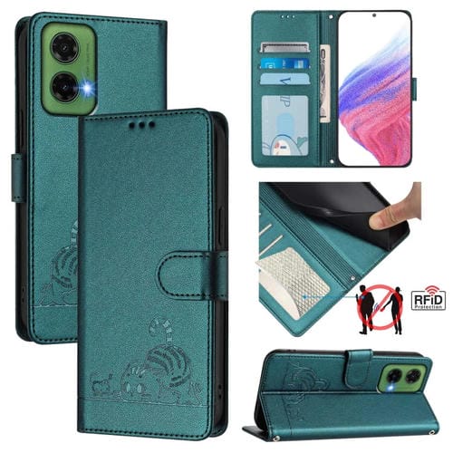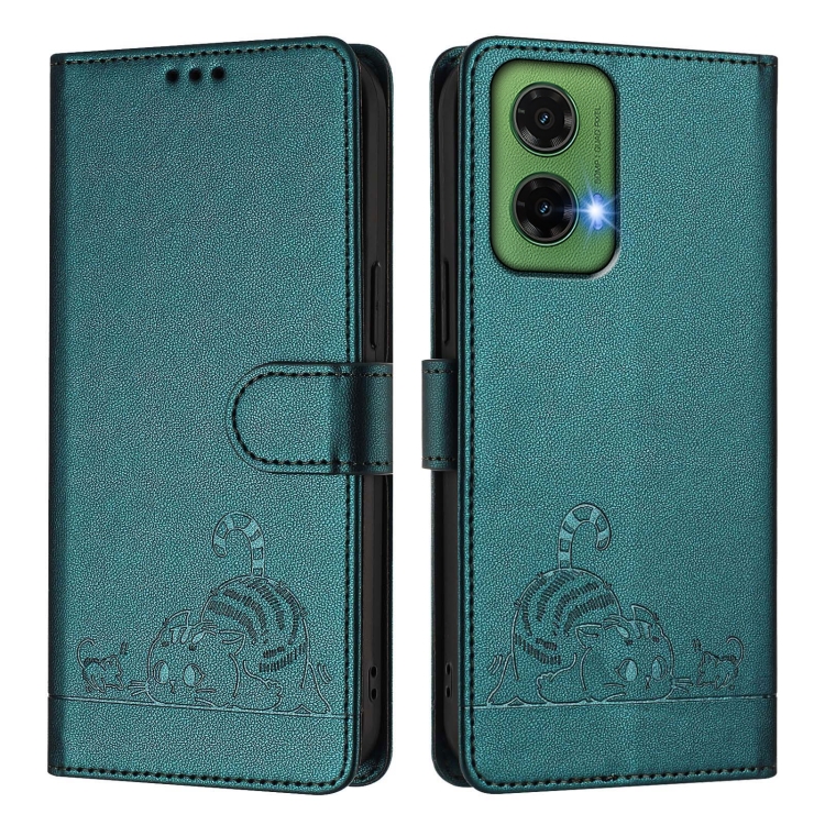 Funda de Cuero Rfid Motorola Moto G35 con Estampado de Rata y Gato y Cordón (Verde Pavo Real)
