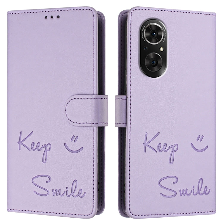 Funda de Cuero Rfid con Relieve Sonriente para Huawei Nova 9 Se (Morado Claro)