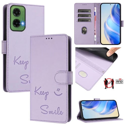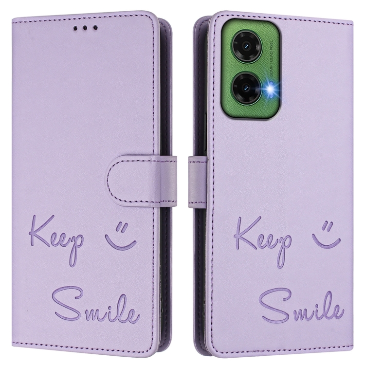 Funda de Cuero RFID Motorola Moto G35 con Relieve Sonriente (Morado Claro)