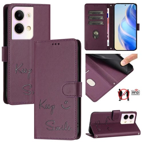 Funda de Cuero Rfid con Relieve Sonriente para Oppo Reno 9 5G/Reno 9 Pro 5G (Violeta)