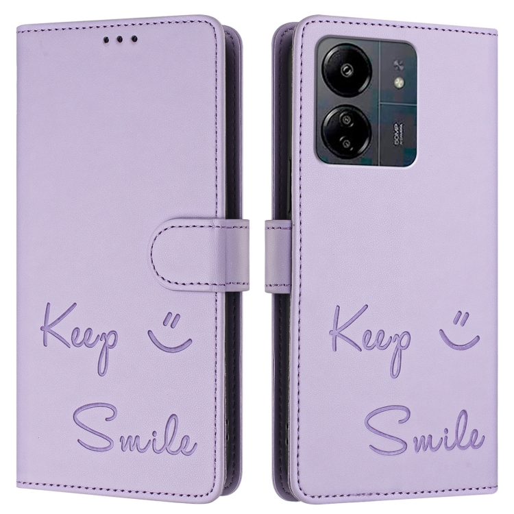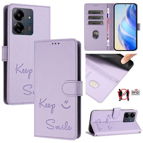 Funda de Cuero Rfid con Relieve Sonriente para Redmi 13C 4G (Morado Claro)